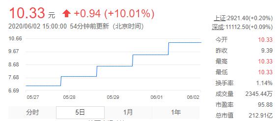 今日(6月2日),格力地产迎来复牌后第7个涨停板,股价报收每股10.33元,较5月25日的每股5.83元,涨幅已达到77.19%。