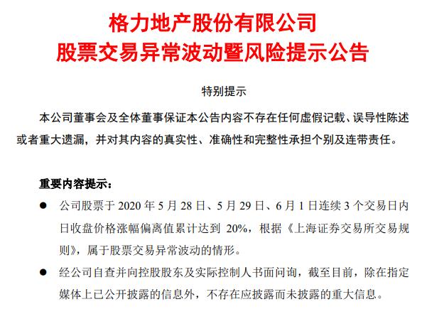 6月1日晚,格力地产发布股票交易异常波动暨风险提示公告表示,公司股票连续3个交易日(含6月1日)内收盘价格涨幅偏离值累计达到20%。同样,在5月25~27日,格力地产连续3个交易日内日收盘价格涨幅偏离值累计亦达到20%。
