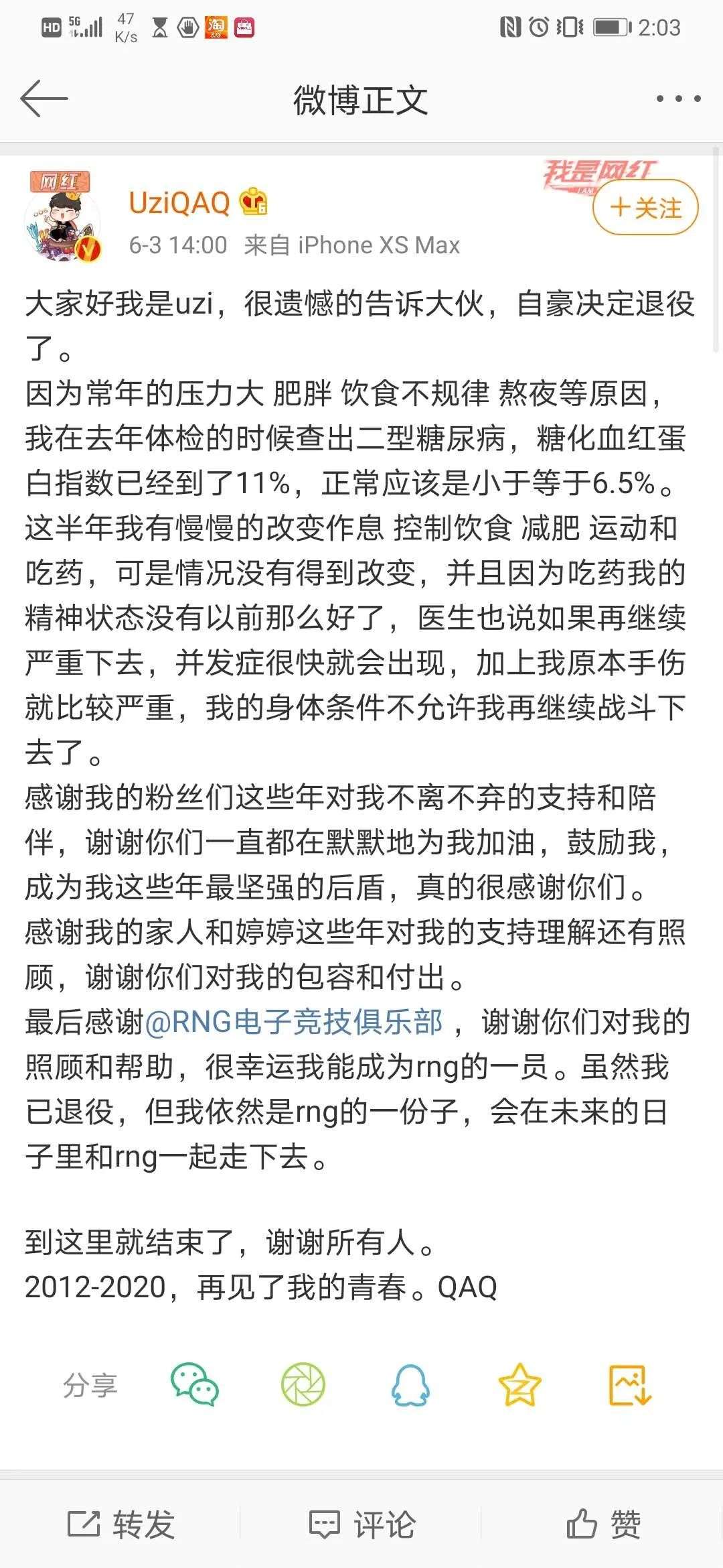 他在自己的微博中表示,长期精神压力过大,高强度的训练,以及不规律的作息等因素,身体健康状况受到极大影响,加上此前严重的手伤,已经无法再让他在AD位置上继续战斗下去,遗憾告别赛场。