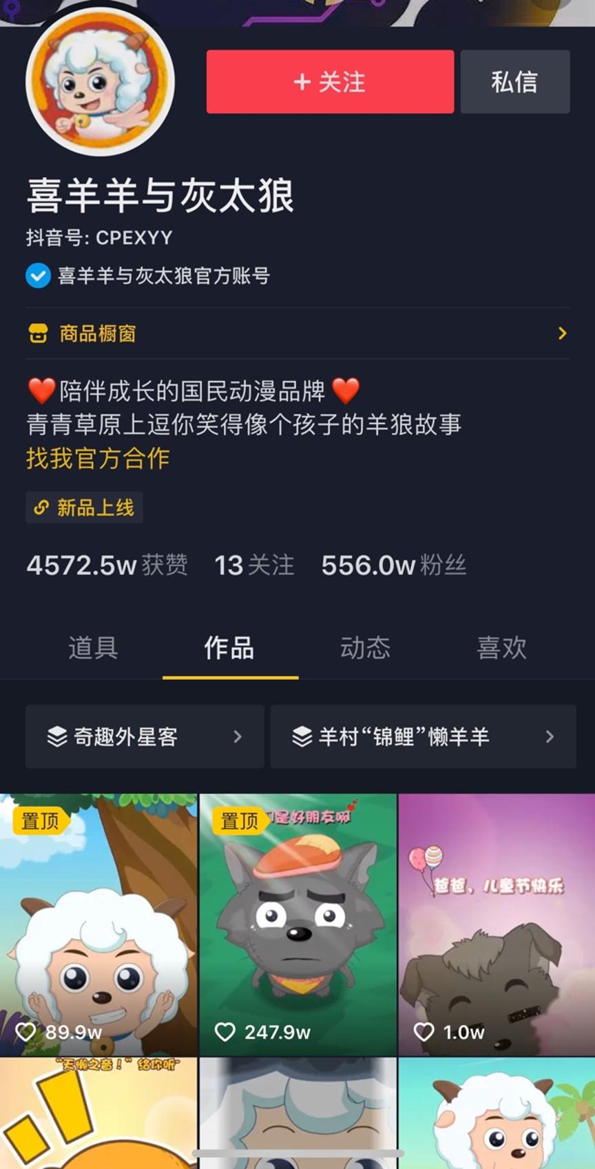 疫情之后,奥飞也选择在抖音建立自己的阵地,靠着喜羊羊与灰太狼的经典IP做短视频运营和直播,目前喜羊羊与灰太狼的抖音号已经有500万粉丝。