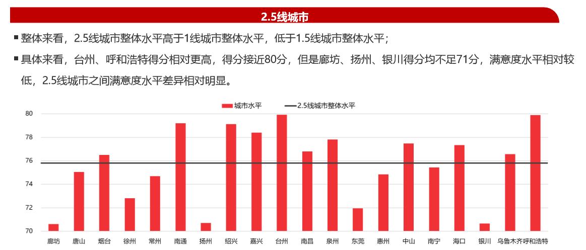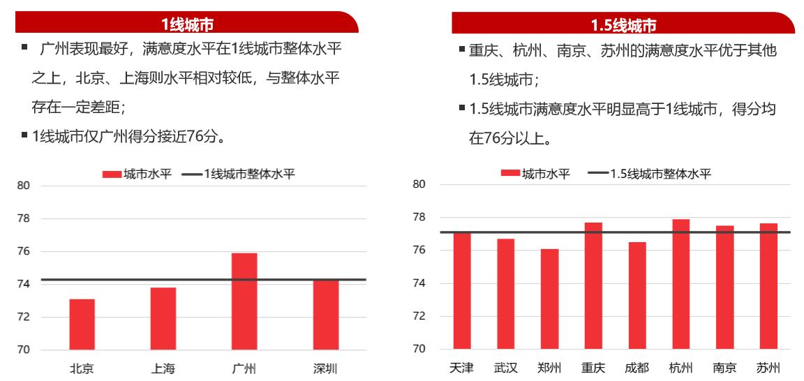 而1.5线城市满意度水平明显高于1线城市,得分均在76分以上,而一线城市中仅广州得分接近76分。