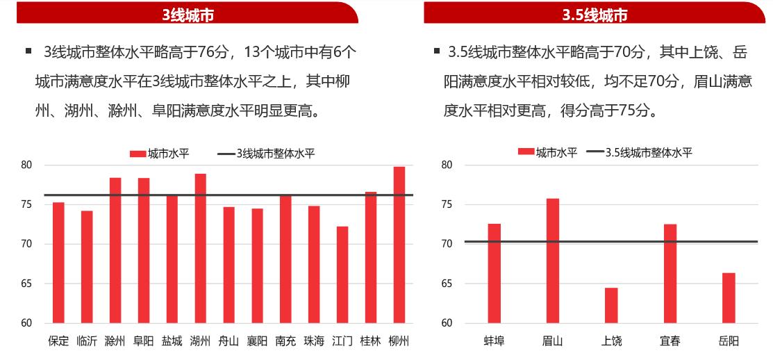 三线城市整体水平略高于76分,13个城市中有6个城市满意度水平在三线城市整体水平之上,其中、柳州、湖州、滁州、阜阳满意度水平明显更高。