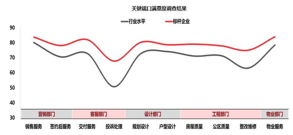 值得一提的是,在本次抗疫中发挥了重大作用的物业满意度也在提升。《报告》显示,营销与物业是满意度水平相对较高的两个职能部门,其中销售服务与物业服务是行业水平及标杆企业中得分最高的两个指标;客服端标杆企业优势最为明显,其中交付服务领先9分左右;投诉处理领先优势更是超过15分。