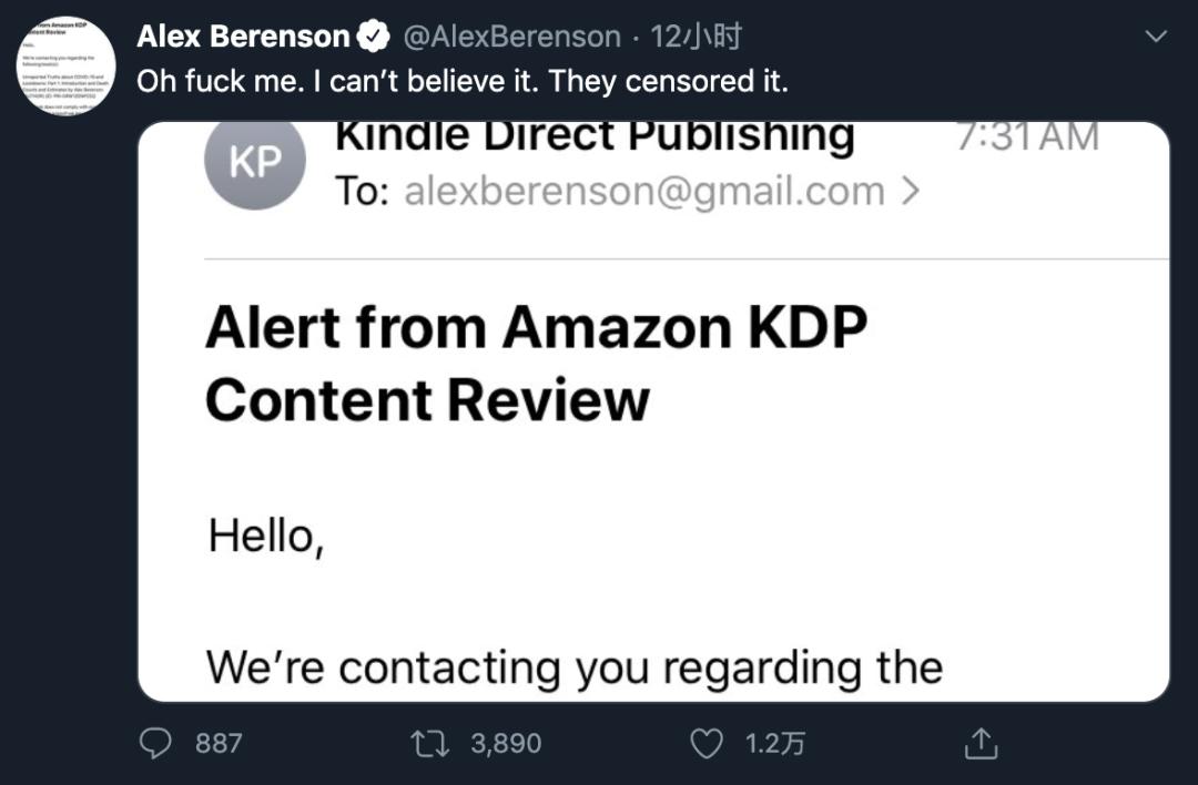 Alex Berenson收到亚马逊的拒绝邮件后当即发了推特叫屈。「他们竟然把我的书给审核了!」