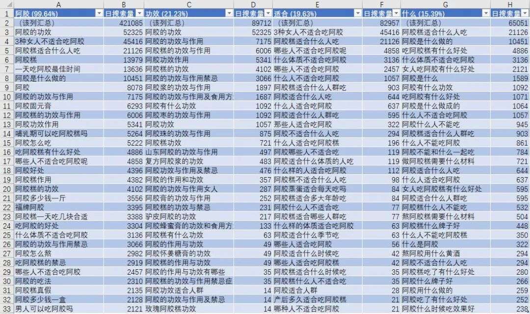 以“阿胶”行业为例,很多人在投百度关键词的时候,经常投放“阿胶购买”“上海阿胶”“杭州阿胶”之类的词;但看下图,我们就知道权重高的词究竟有哪些。很多人压根没有找到这些词,很多词至今还没有被投。