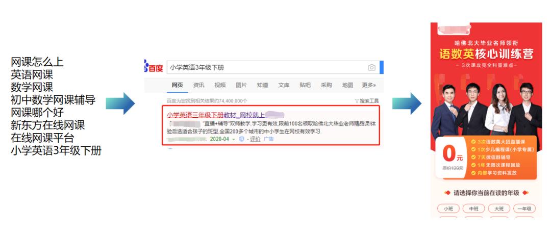 非常常见的反面案例普遍发生在今天的广告投放环节。首先说搜索引擎投放。这里有一个教育行业投放的真实案例,先选择了若干关键词;针对“小学英语3年级下册”这个关键词去投放,在广告文字创意上突出的却是“双师课和领取哈佛北大老师精品课”;但落地页又在说“语数英训练营”。很多人问为什么广告投放的效果差?通过这个案例可以看到需求和供应之间完全是割裂的。