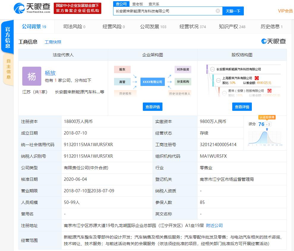 长安、蔚来合资公司注册资本新增至1.88亿元人民币,增幅为91.84%