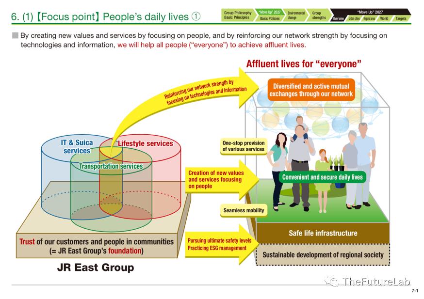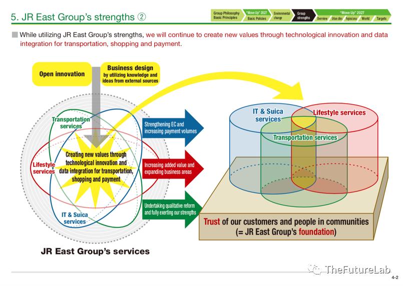 “Move up 2027的目标是创建以人为本的服务,并将运输服务,生活方式服务以及IT和Suica服务整合在一起。依托强大的基础设施建设能力和多层真实的交通网络,这使得JR East在服务创新方面有很大的优势。JR East将建立一个以人为本的生态系统,将技术创新和大数据相结合,以不断创造新价值,为顾客提供创新服务与体验。”