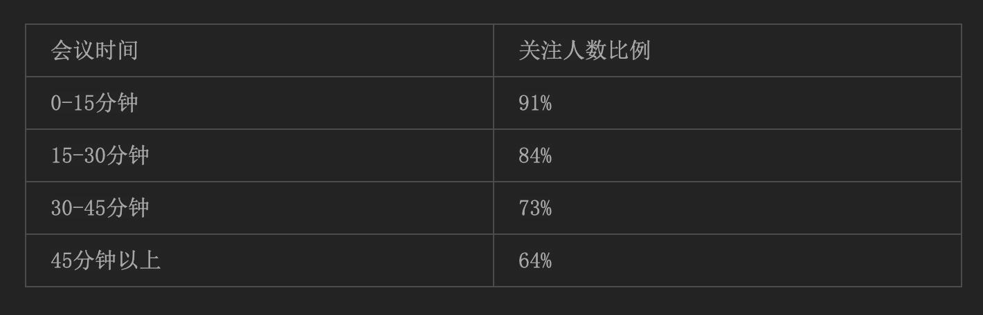 领导必须学会自我管理。因为研究表明,约30分钟后,参加会议的人数开始迅速下降。会议持续时间越长,注意力水平下降越快。可以肯定的是,一个小时后,领导已经失去了一半与会者的注意力。