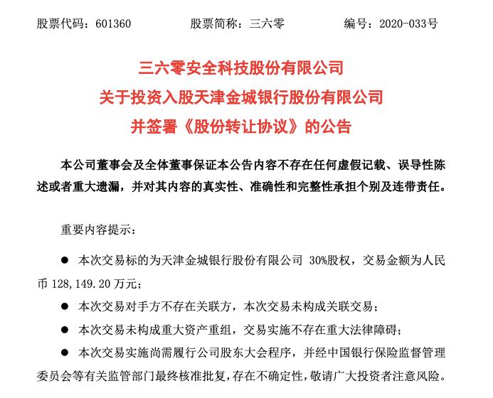 6月5日,互联网巨头360集团发布公告称,公司拟按照1.42388元/股的价格,受让天津金城银行股份有限公司5名原发起股东合计持有的90000万股股份,交易金额合计为人民币128149.20万元。
