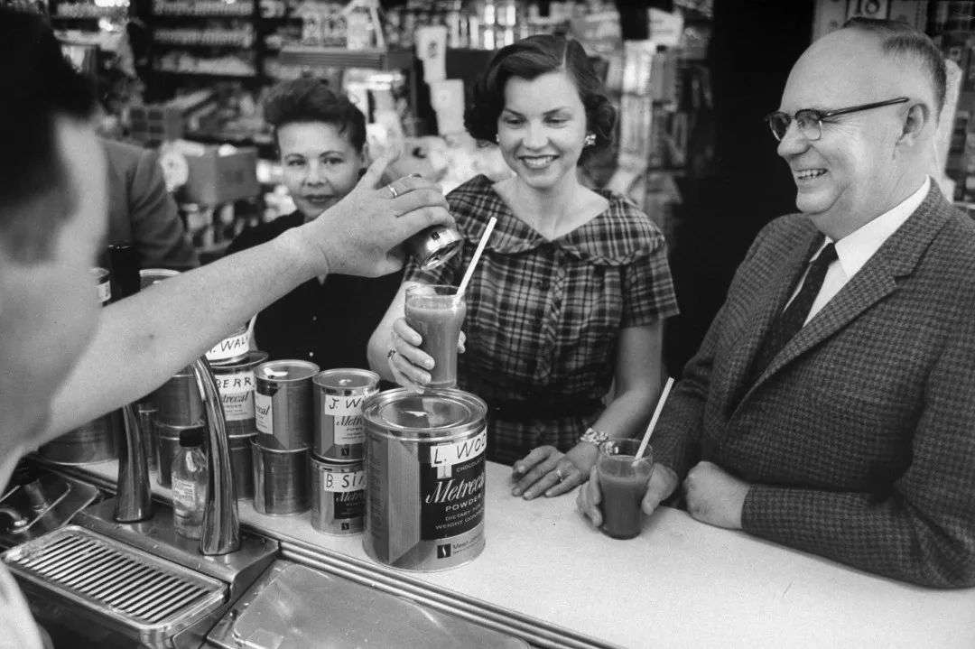 1960 年,在南卡罗来纳州一个冷饮柜台,店员正为一名女性顾客提供 Metrecal 代餐饮品。