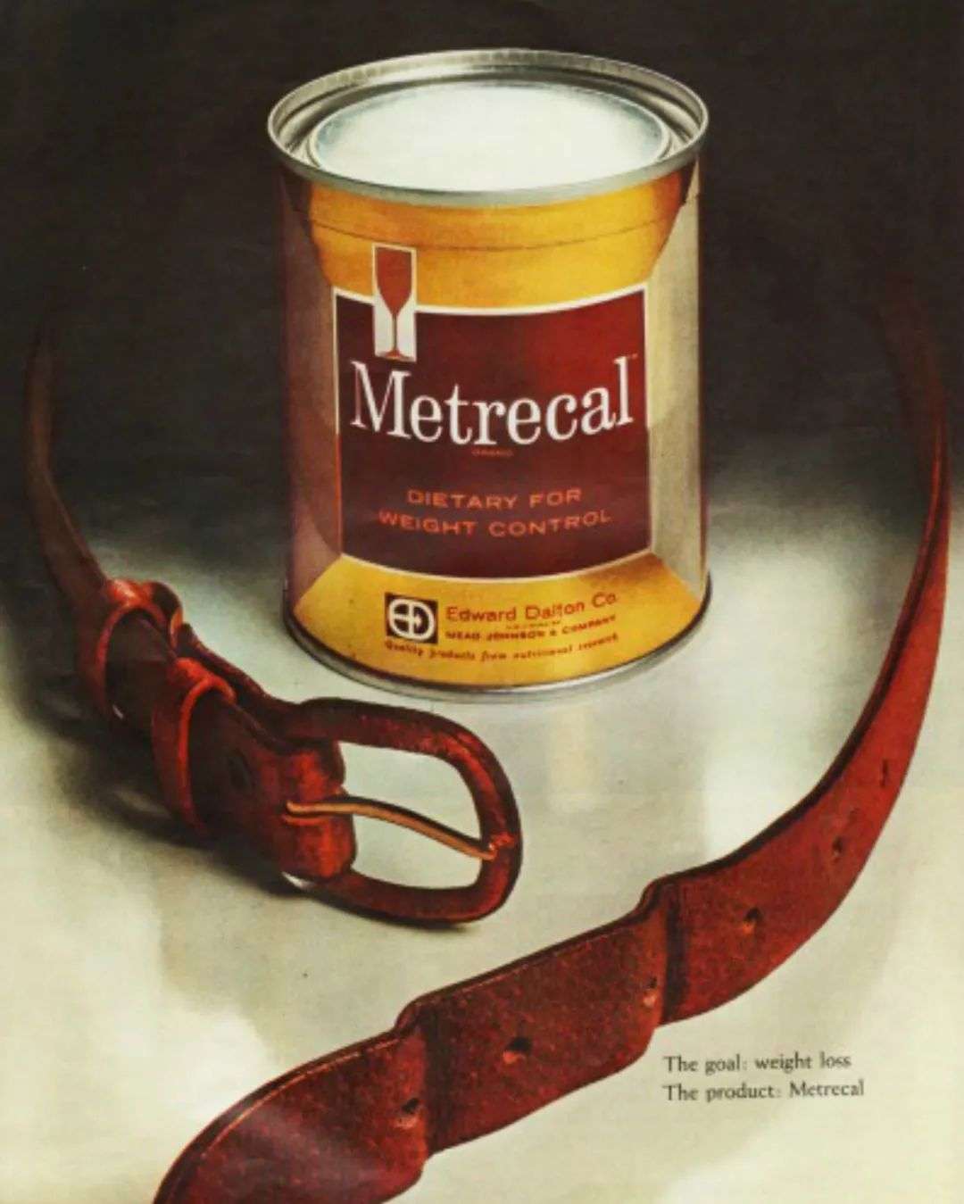 1959 年,作为代餐减肥概念的前驱,Metrecal 率先推出了针对减肥人群的流质食物。从上世纪 60 年代到 90 年代,流食因为可以比较直观的确认卡路里摄入量,广受减肥群体的喜爱。Metrecal 也在广告中明确强调减肥的功效,吸引想要保持身材的女性购买。