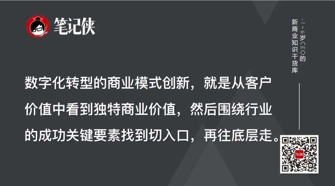 数字化转型的商业模式创新,就是从客户价值中看到独特商业价值,然后围绕行业的成功关键要素找到切入口,再往底层走。