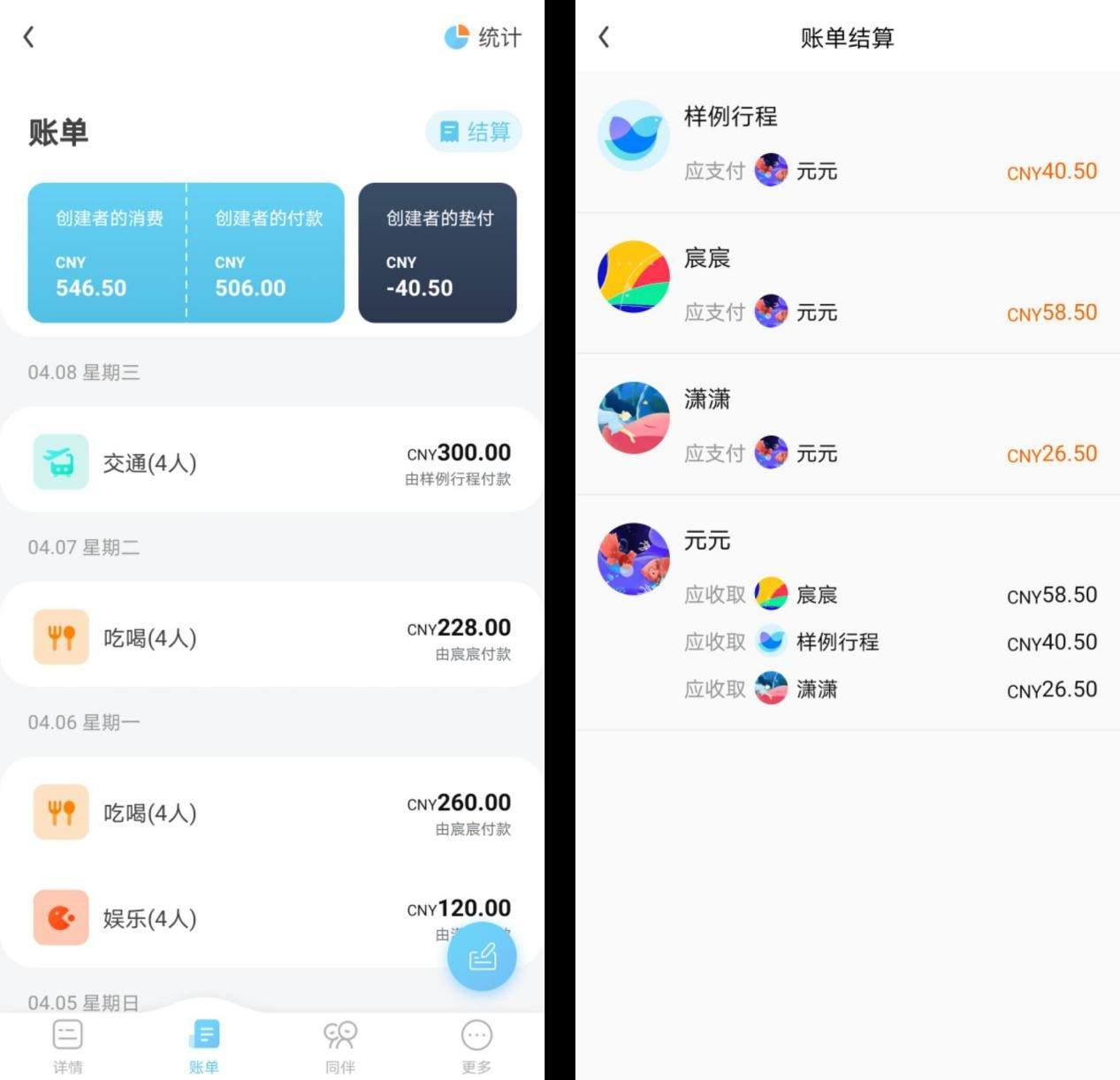 二、行程账单。对于多人出游而言,旅行记账和账单结算不便。「与途」的同行者共享账本支持多人协作记账,并在旅途结束后自动生成账单,方便同行者结算。