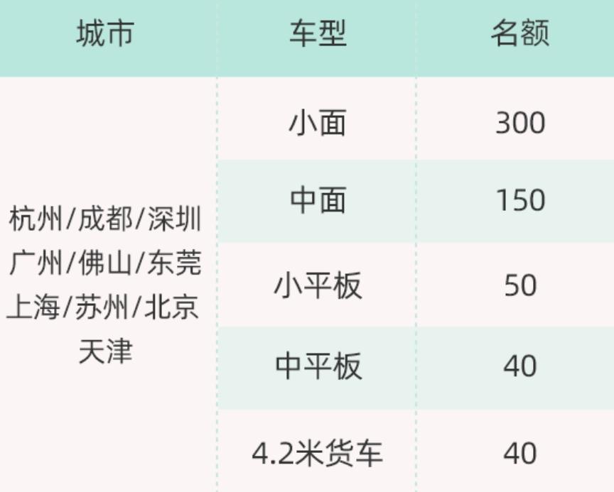 但滴滴并未开放大量名额,目前,滴滴货运在每座城市的司机注册名额只有580个,其中,小面和中面是主要的招募车型。
