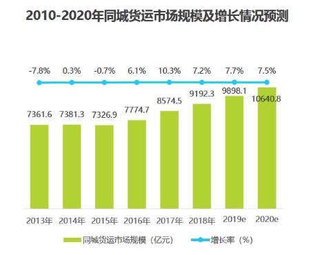 艾瑞咨询《2019年中国同城货运行业研究报告》显示,同城货运在未来3-5年预计仍将保持5%-7%的增速,预测2020年,规模将突破万亿。