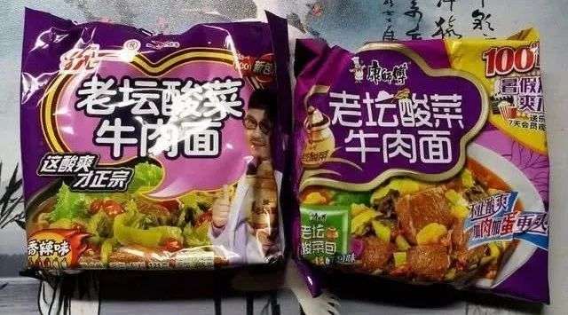 同理,在超市终端的货架上,老坛酸菜牛肉面方便面包装,为什么统一、康师傅、今麦郎品牌都非要使用紫色的包装设计呢?