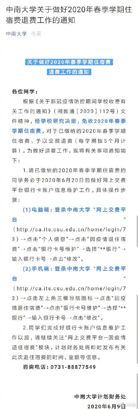 今日,中南大学宣布免收春学期住宿费,对已缴纳的住宿费予以全额退费。此前,山东、广东已有多所高校发布公告,将结合学校实际情况,免缴春学期按5个月计算住宿费,已缴住宿费将退还。