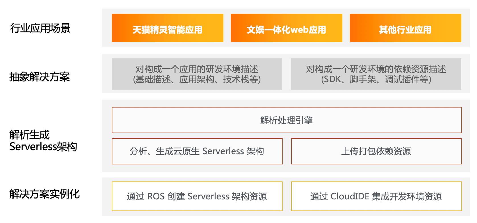 杜欢告诉36氪:“当云开发平台去解析一个解决方案,核心会做两件事情,一是分析和生成一个基于阿里云产品矩阵构成的云原生 Serverless 架构,另一件事情是将依赖的资源做打包上传等预处理;然后开始生成任务,逐一进行生产、创建、安装,直至一个行业应用被初始化完成,用技术的语言来类比的话,这是应用云服务的“序列化与反序列化”的过程。”