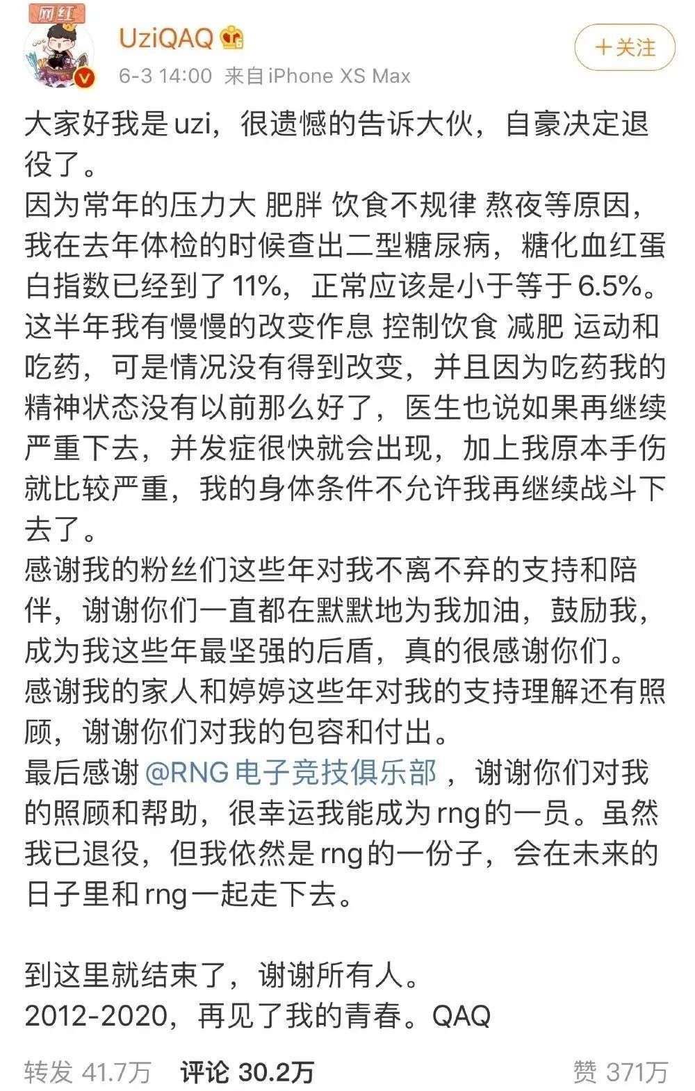 这条「退役微博」,截至目前,得到了41.7w的转发,30.2w的评论和371w的点赞。
