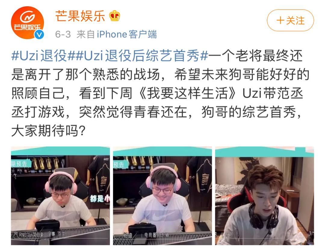 6月9日,芒果娱乐《我要这样生活》综艺首秀。近年来各类电竞题材的影视剧作品、综艺热播,让“电子竞技”被越来越多的人所熟识,电子竞技也正在成为一种主流文化。此次Uzi的退役后综艺首秀,也必然会给节目带来一波热度。