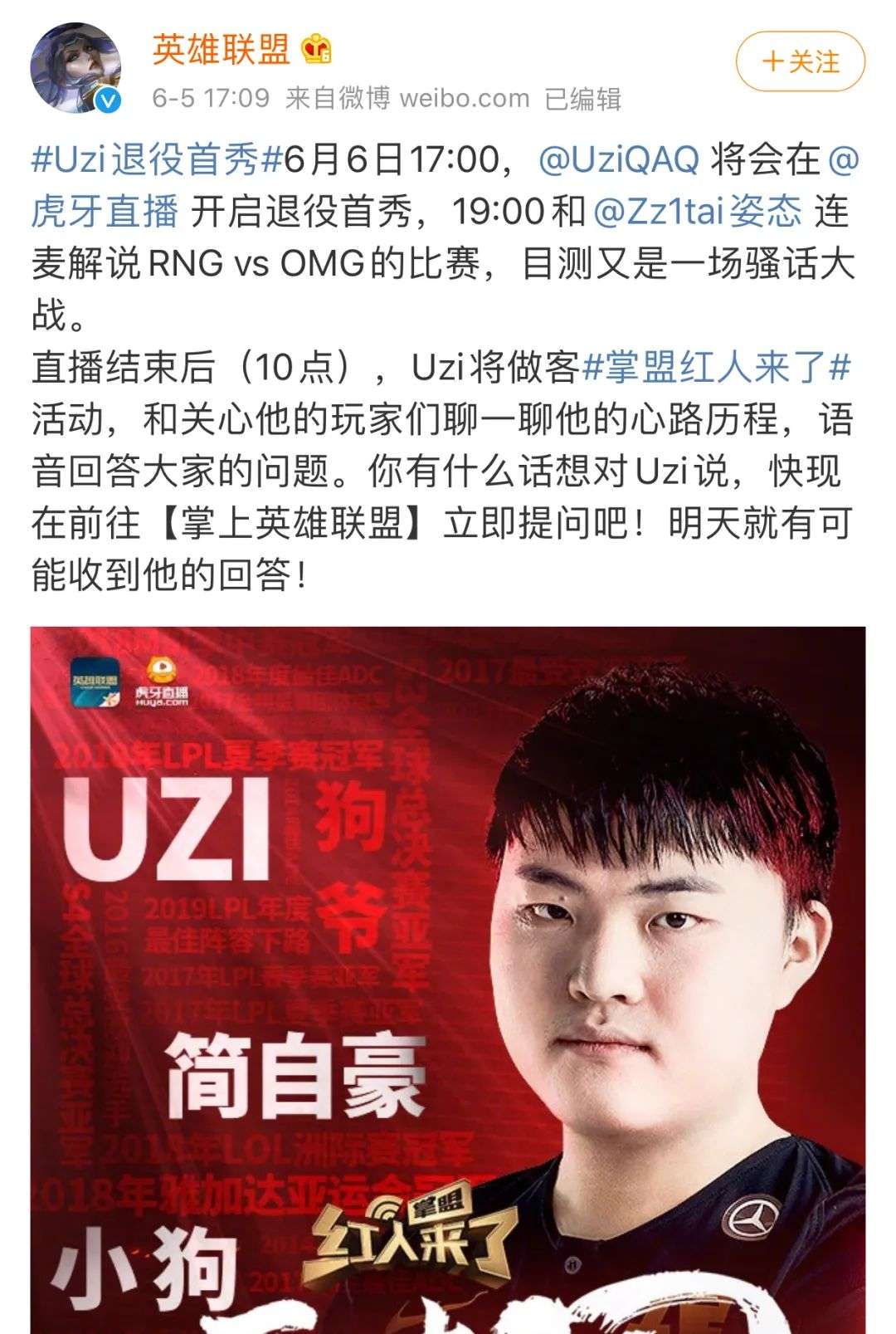 6月6日,Uzi在虎牙直播担任游戏解说,并在直播结束后做客直播间节目#掌盟红人来了#。