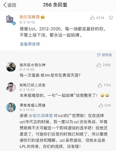 有粉丝在@哈尔滨啤酒 给Uzi退役微博的评论中说:“感谢对uzi的广告赞助!在您选择uzi做代言的时候,我一度以为uzi还会再战,毕竟赞助商不太可能签一个即将退役的选手吧!但他还是退了,可能你们在签约的时就已知晓了,所以要感谢你们的坚持和理解。uzi虽然退役,但他永远是LPL的传奇,你们的选择,没有错!”。