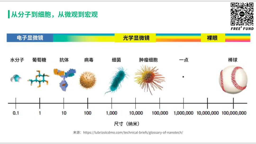 把分子到细胞按照尺寸大小排个序,最左边的是小分子,大概在几个纳米这个范围。大分子药物的尺寸比小分子大了 1-2 个数量级,达到 20 纳米左右。基因疗法目前使用最广泛的是腺相关病毒,大概和抗体的尺寸相当。其他类型的病毒载体一般都会更大一些,达到 100 纳米左右。跟我们人体的真核细胞相比,还是小 2-3 个数量级。这还都是在微观层面,需要借助显微镜才能观察和研究。而到了肉眼可见的层面,比如我们能看到的一个点,就又比细胞大了约 100 倍。