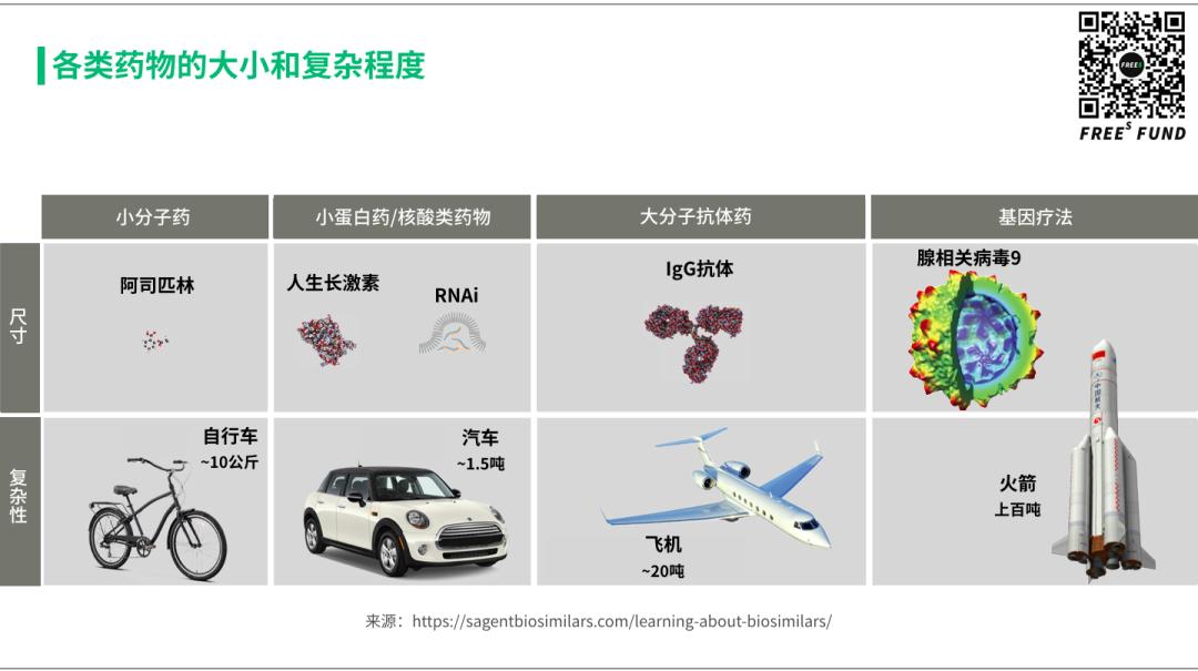 让我们再用交通工具来作类比,试着理解不同药物的特点。小分子药就像自行车,它的制造和生产是最容易的。短肽类和小核酸类药物就像汽车,重量增加了不少,也复杂了不少。大分子药(抗体)就像飞机,而基因疗法使用的病毒载体就像火箭。