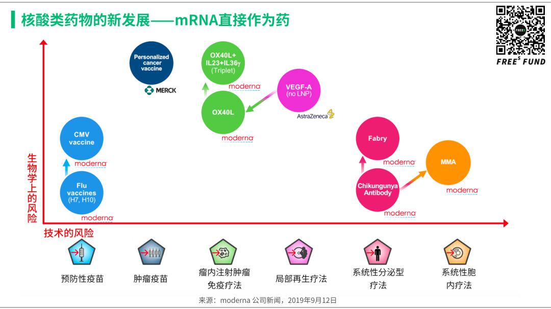 关于 Moderna 公司产品管线,这里我们多说两句。请看这张图,来自于公司去年的一次投资人关系会议上的宣讲材料。这个产品管线布局的策略和思路非常有意思,值得所有新型治疗手段的研发者参考。