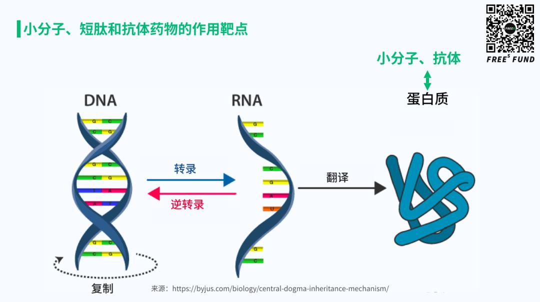 2,小分子和短肽、抗体类药物作用的「靶点」是蛋白质,调节蛋白的功能;核酸类药物作用的「靶点」是mRNA,调节蛋白的表达;基因疗法药物作用的「靶点」是DNA,不仅可以改变蛋白的表达,甚至还能够可遗传地修改蛋白的编码序列。