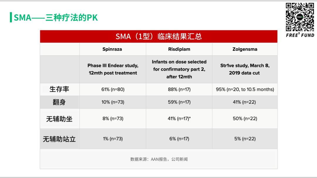 从疗效上看,目前公布的临床结果,生存率上基因疗法看起来是最好的,95%都能存活;从患儿翻、坐和站的改善情况来看,小分子和基因疗法差不多,都比 Spinraza 数据要好。