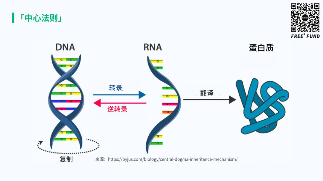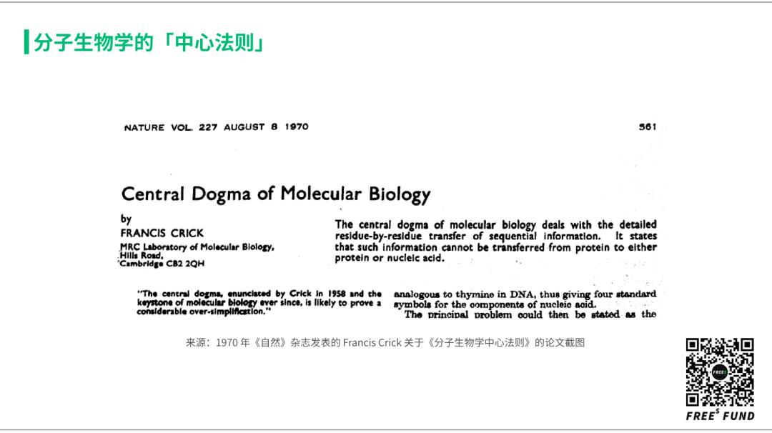 要理解这个问题,我们先来重温一下现代生物学基础——「中心法则」。「中心法则」是佛朗西斯·克里克 1958 年时就提出的,1970 年他写了一篇文章,发表在《自然》杂志上。这个文章的核心就是一句话,「分子生物学的中心法则旨在详细说明连串信息的逐字传送。它指出遗传信息不能由蛋白质转移到蛋白质或核酸之中。」这句话非常拗口,其实就是在回答遗传信息是如何传递的这个问题。