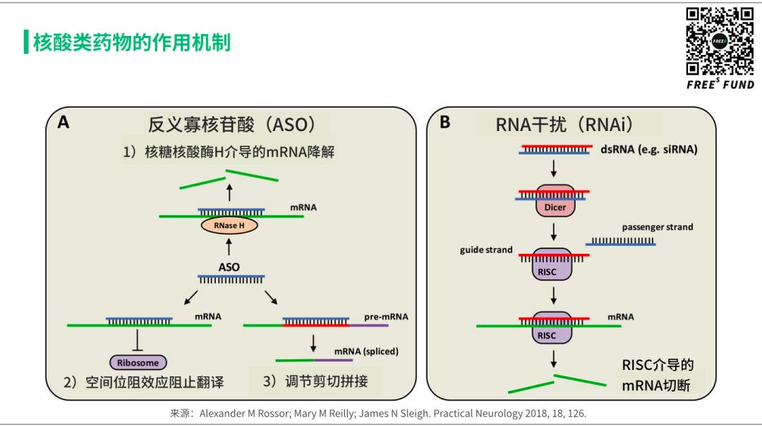 简单来说,无论是单链的DNA或RNA(ASO),还是双链的dsRNA(RNAi),它们与靶向的 mRNA 结合之后,将 mRNA 直接降解掉,或者阻碍其翻译成蛋白,或者影响其拼接而表达不同形式的蛋白。无论如何,蛋白的表达量(或者表达形式)被改变了,这就是核酸类药物的作用机制。