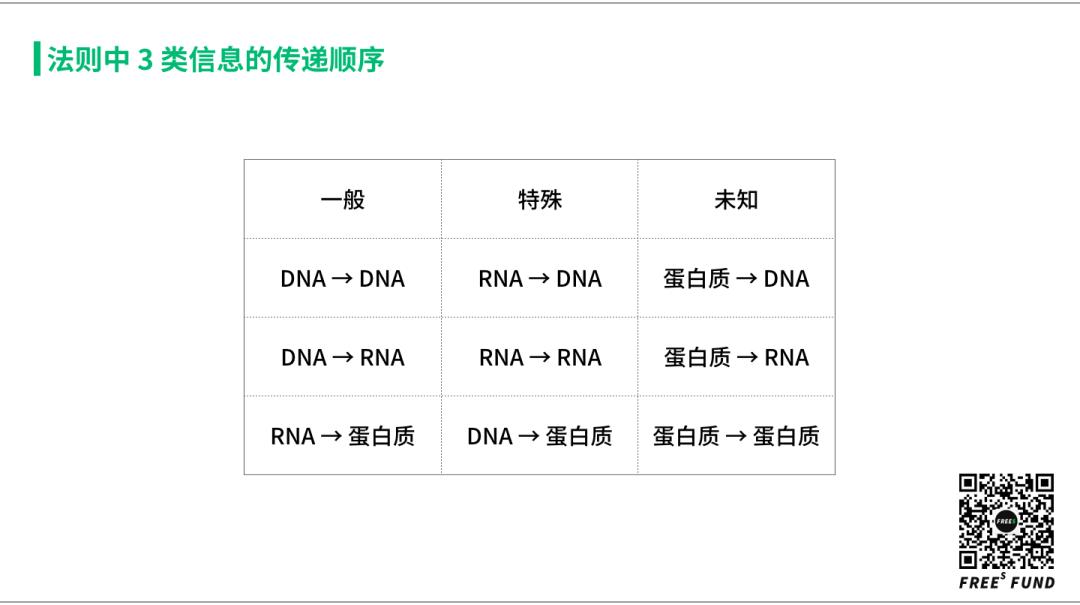 克里克解释说,对于生物体中三类主要生物大分子:DNA、RNA 和蛋白质,有 9 种可能的传递顺序。法则将这些顺序分为三类,3 个一般性的传递(通常发生在大多数细胞中),3 个特殊传递(会发生,但只在一些特定条件下发生),3 个未知传递(可能不会发生)。