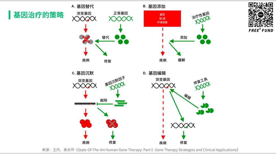 基因疗法大体上可以分为四个方向,分别是基因替代、基因添加、基因沉默、基因编辑。