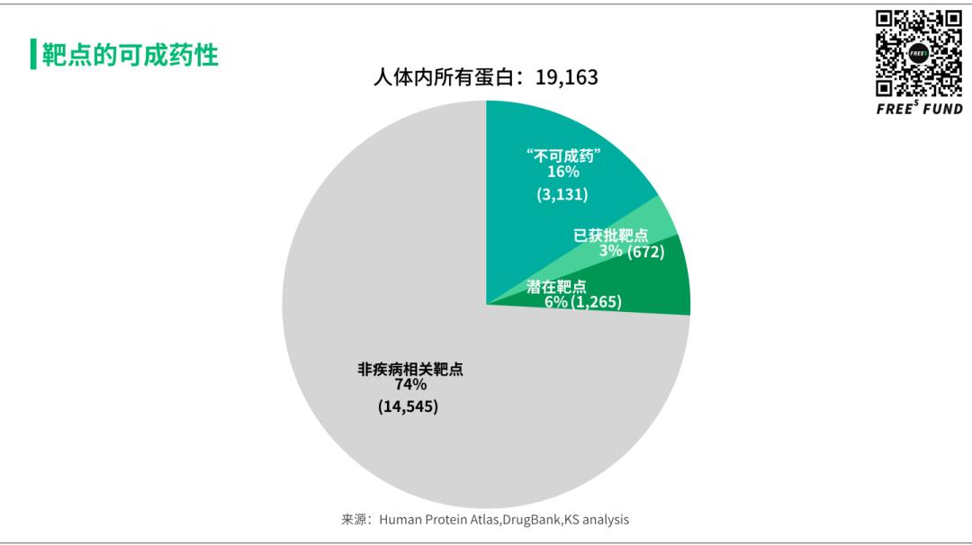 人体内,大概一共 1 万 9 千多种蛋白,目前发现大约 5000 多种蛋白(约占1/4)跟疾病相关。这其中目前已经获批的药物针对的靶点大概有近 700 种,潜在的可成药靶点大概有 1200 多种,另外还有 3 千多种疾病相关蛋白被称为「不可成药」。