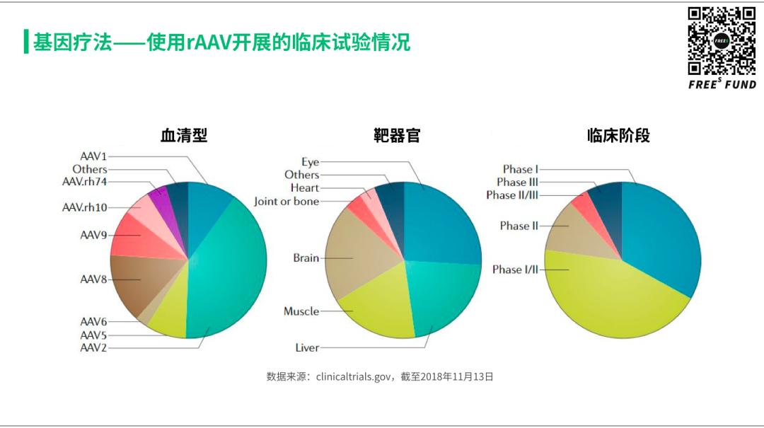 幸运的是,人们很快发现了腺相关病毒(AAV)可以作为这样的递送载体,将药物高效递送进入细胞核发挥作用,同时安全可控,对人体带来的风险和副作用较小。截至 2018 年底,约有 145 项使用 AAV 进行基因治疗的临床实验,针对的器官主要是眼睛、肌肉、肝脏和神经系统。当然绝大部分适应症都是单基因异常造成的遗传性疾病或者罕见疾病。但随着技术上的风险和不确定性被逐渐降低,基因疗法会很快拓展到像 AMD、帕金森氏症等常见疾病中。