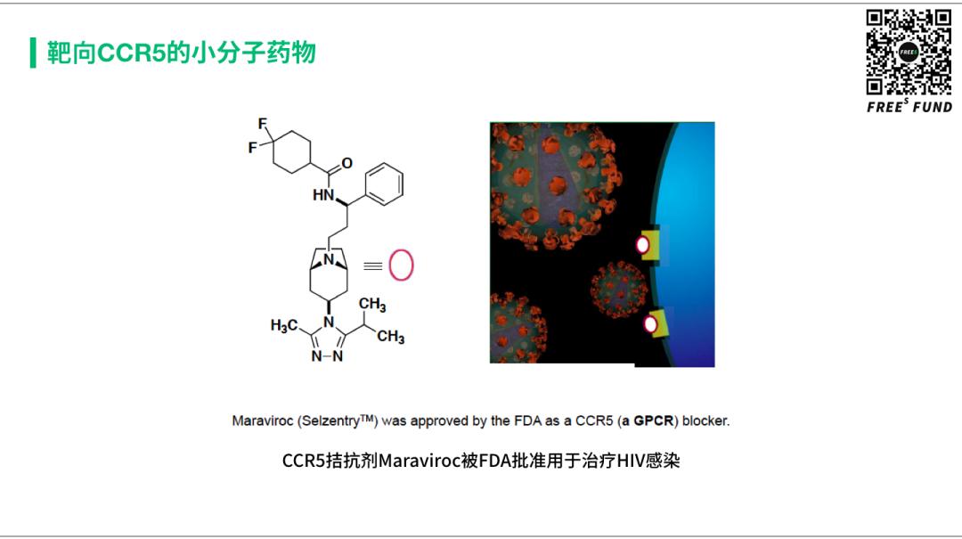 CCR5 是一个 GPCR,在 T 细胞上。HIV 病毒要想感染 T 细胞,需要结合这个受体。最开始发现这个基因跟 HIV 有关,是来自于一项流行病学研究。这项研究发现一小部分高风险人群对 HIV 病毒不易感,而该人群中编码 CCR5 的基因发生突变。随后在大规模人群基因测序中发现,在白种人中,大概有 10-20% 的人这个基因缺失了一半;大概有 1-2% 的人群这个基因彻底缺失,而这部分人几乎完全抵抗 HIV 感染。科学家随后发现了 CCR5 的功能和在 HIV 感染细胞中的关键作用。