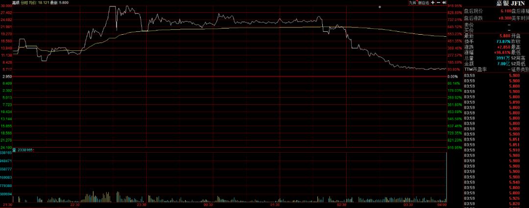 截至美股收盘,嘉银金科暴涨逾96%,稳盛金融涨170.8%,金融界涨逾51%;房多多收跌66%,前一交易日房多多股价一度暴涨逾1200%,熔断14次。
