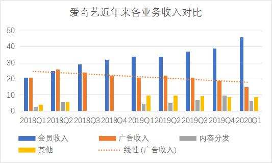 爱奇艺于2018年3月29日在美国纳斯达克上市,上市后的第一季度,其广告收入达到了26亿元,这应该是迄今为止它的历史最高纪录。随后,它的广告收入就一路向下,与会员收入的一路上涨形成了此消彼长的有趣现象。