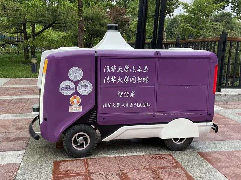 当天下午3点半左右,车东西在清华大学海淀校区的李文正馆前见到了智行者的无人配送车,以紫色为底色的无人配送车上贴着写有清华大学汽车系、清华大学图书馆、智行者的图样。