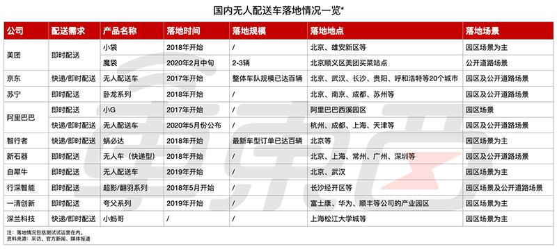 而在落地场景上,既有封闭、半封闭园区场景,同时也有部分无人配送车开始驶上了公开道路。