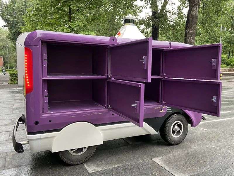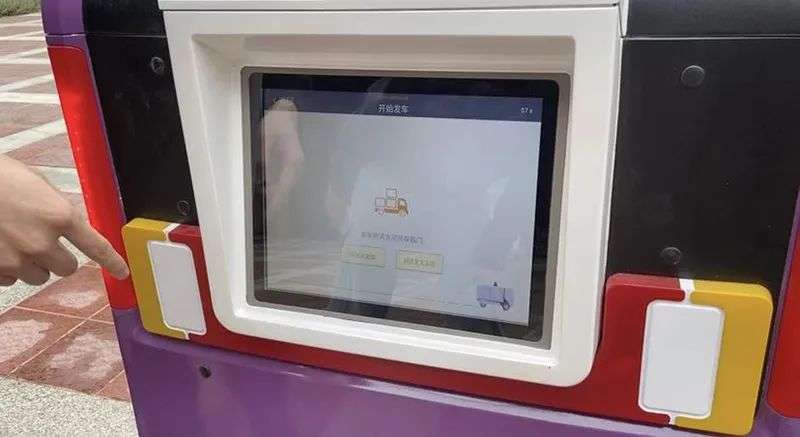 无人配送车的车尾部分有一个人机交互界面,目测大小没有到14英寸(普通笔记本电脑大小)。