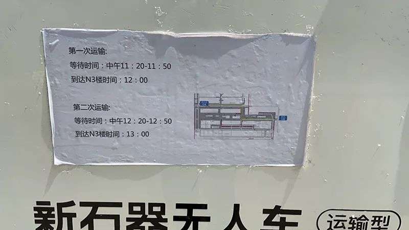 当天中午11点10分左右,新石器的运维人员接到了团餐到达的通知。之后,得到指令的新石器无人配送车便正式开始了自己的工作:先从停车点到大门口取餐,然后再按照既定的路线将餐送至目的地N3楼。