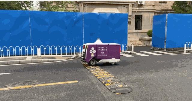 当它送完餐并按照规定路线返回出发点的时候,它遇到了一个新的道路护栏,这个护栏把它的路完全挡住了。在这种情况下,无人配送车不得不停下来。直到运维人员把护栏挪开后,它才得以重新启动。