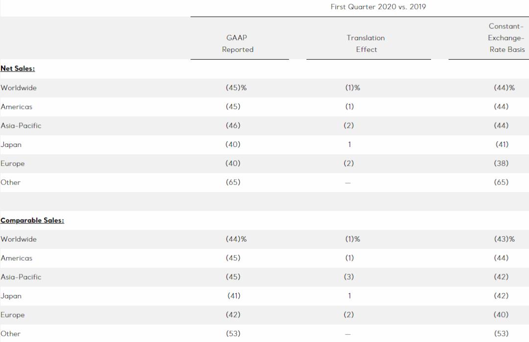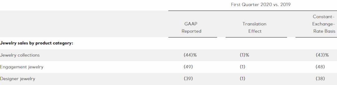 欧洲市场表现也不理想,Tiffany的门店从3月中旬开始暂停营业,直到4月下旬才缓慢地重新开放,销售额因此大跌40%至6100万美元。全球其他地区的销售额也同比大跌65%至900万美元,除疫情外,还受到钻石批发销售额减少影响。