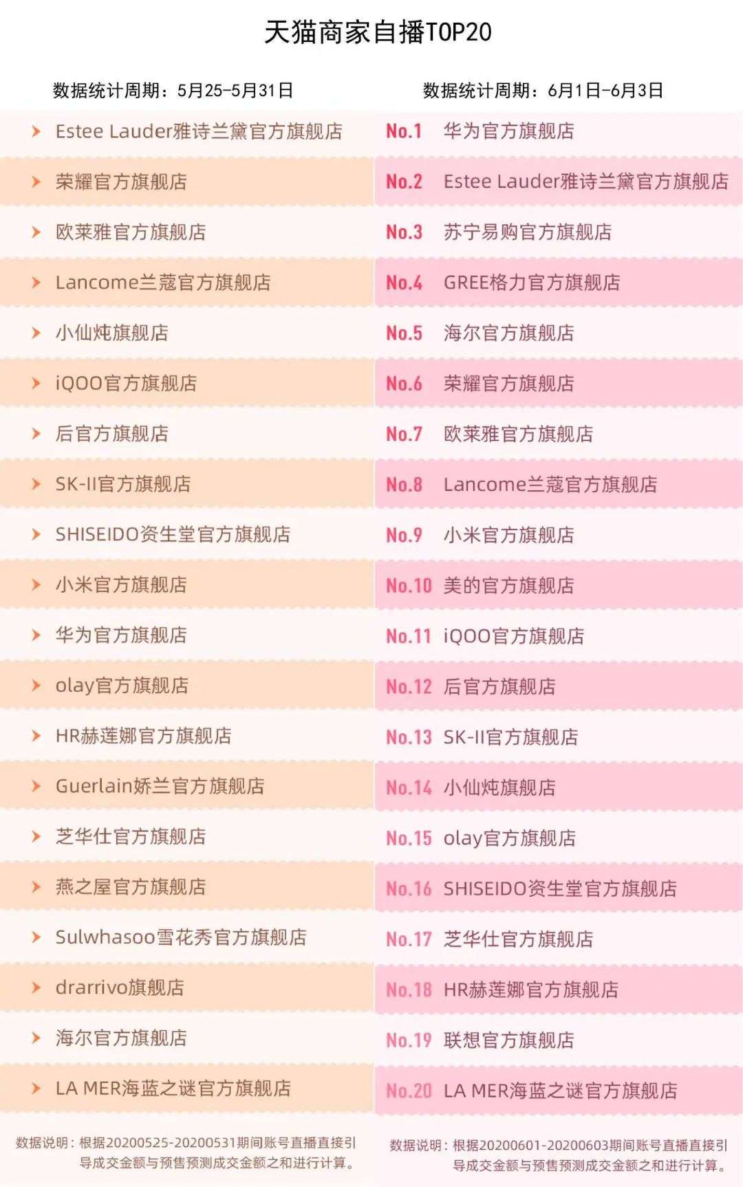 截至目前,天猫618期间共出了两份榜单,可以清晰地看出欧莱雅、华为荣耀、雅诗兰黛等品牌尽管排名有所变动,但稳居榜单前十。