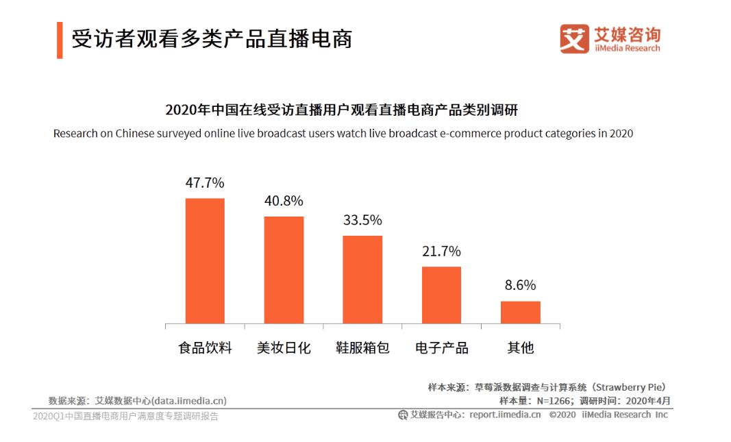 艾媒咨询数据也显示,其调查的直播用户中,观看直播电商产品类别最多的当属食品饮料、美妆日化。