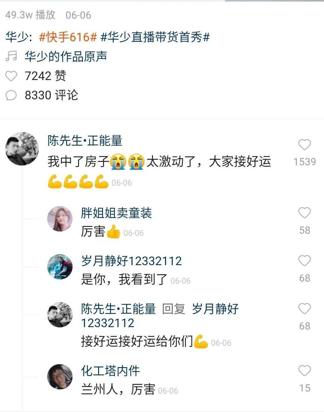 房子中奖者在华少快手号下留言